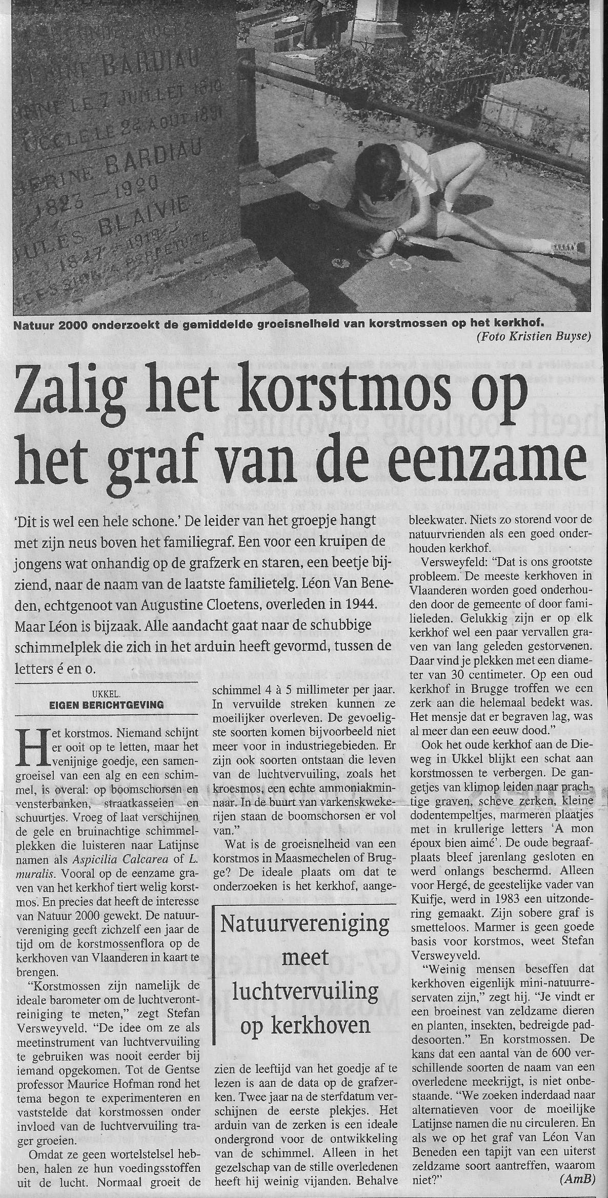 Bron: Arnout ZWAENEPOEL, Maurice HOFFMAN en Regine VANALLEMEERSCH, Mossen, korstmossen en varens op muren en grafstenen van het Brugs kerkhof, pp. 27 t.e.m. 38, Universiteit Gent, Vakgroep Morfologie, Systematiek en Ecologie, Laboratorium Plantkunde, Ledeganckstraat 35, 9000 Gent.