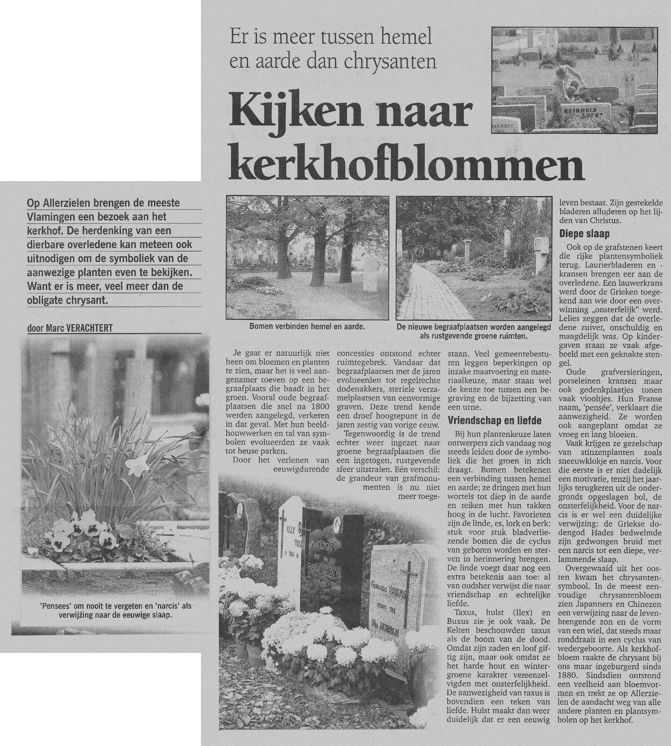 Wie in de komende dagen of weken een bezoek brengt aan een kerkhof, moet van de gelegenheid gebruik maken om ook eens te letten op de vele symbolische verwijzingen naar de dood, het eeuwig leven, de vergankelijkheid van dit aardse bestaan, enz., die men er aantreft. Het moet gezegd dat bij de aanleg van begraafplaatsen de laatste decennia nog maar weinig aandacht wordt besteed aan die funeraire symboliek. Bij de keuze van bomen en struiken die men op het kerkhof plant, is die symboliek zelfs helemaal verdwenen. Nochtans bestaan er tal van bloemen en planten met een eeuwenoud dodensymboliek. Een beknopte ‘funeraire plantencatalogus’.