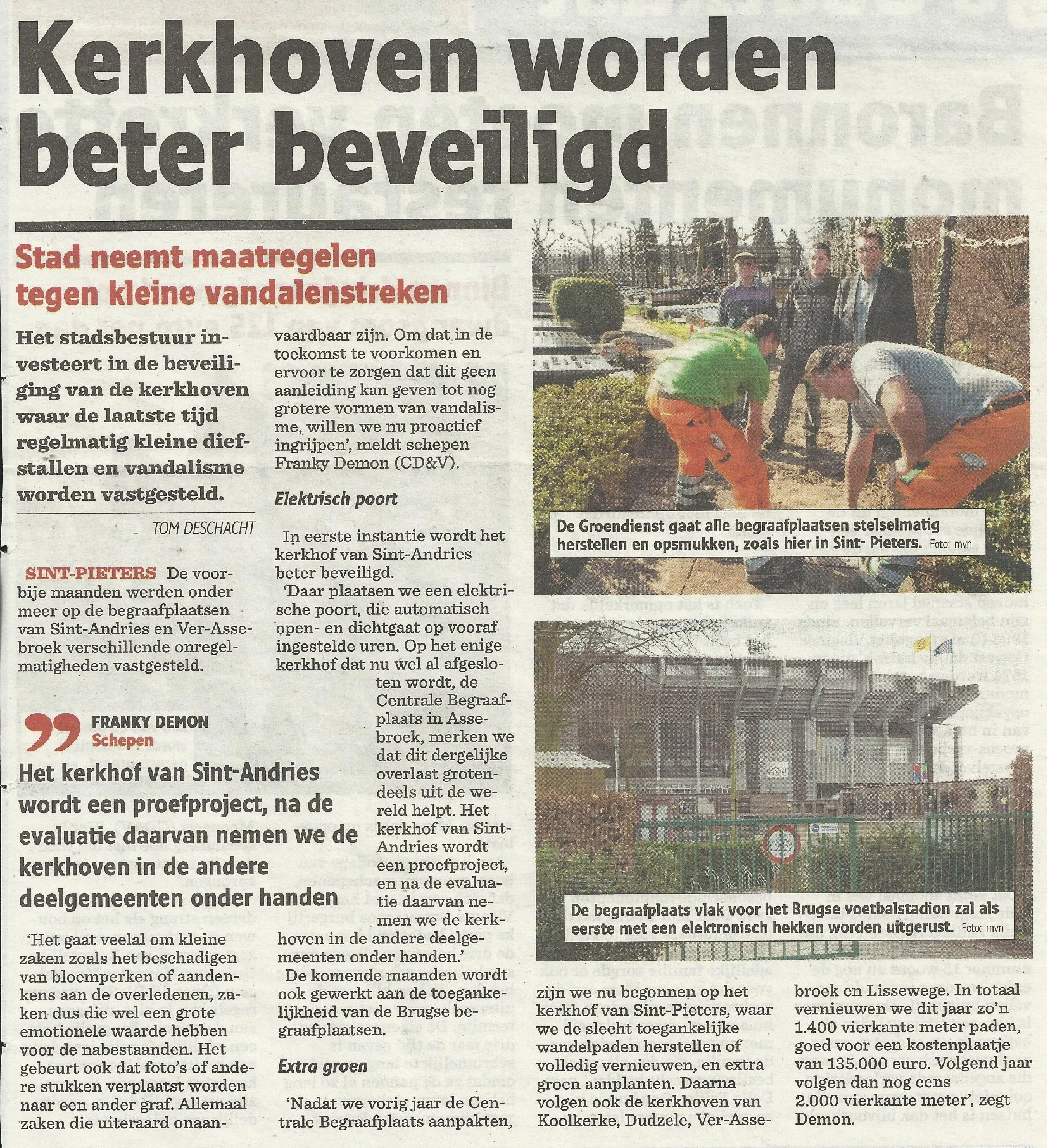 Er is hier een groot gemis aan toezicht op het Brugsch Kerkhof, alwaar de versieringen der grafsteden aan de roofzucht en vernielingsgeest van wangedrochten zijn blootgesteld. Een beter toezicht dringt zich onmiddellijk op, want deze toestand moet ophouden, zooniet is er grootelijks te verwachten dat in geval van ontdekking op heeterdaad van een dief, door een benadeeligde, er erge gevolgen te vreezen zijn.